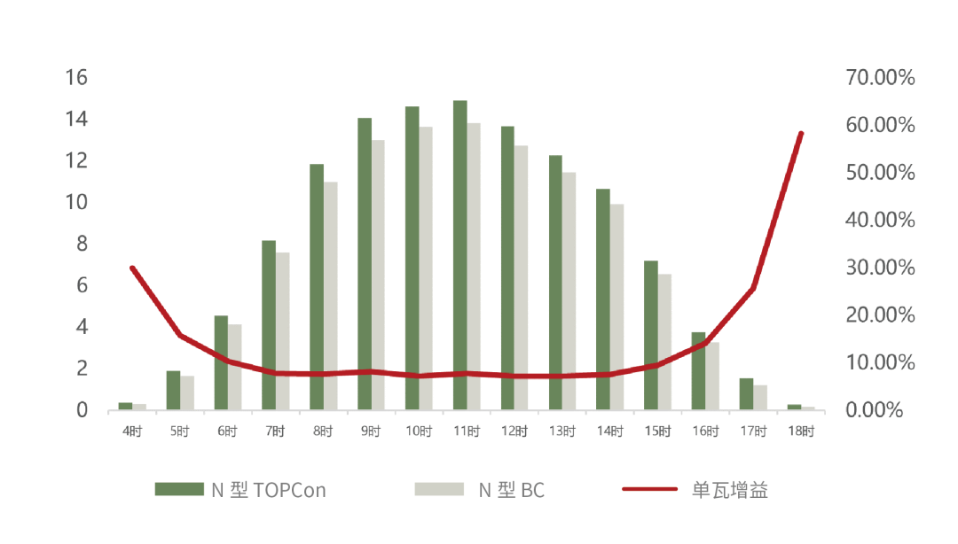 2025年6月2日至30日期间,对两类组件性能进行了全面测试。测试数据显示,TOPCon组件29天单瓦发电量达119.61 kWh/kW,而N型BC组件为110.47 kWh/kW。TOPCon组件平均每瓦长期发电增益达8.27%。深入分析日变化规律发现:在日辐照度较低的时候(辐照度小于400W/㎡),TOPCon组件的发电优势尤为突出,单瓦增益高达10.79%,充分印证了其在极端弱光条件下的卓越性能。